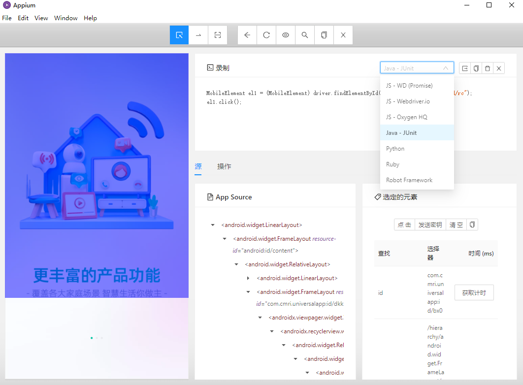 使用appium-desktop有一个很便捷的能力,可以录制操作,直接产生对应的测试代码。使用时,点击开始录制,然后在边上的小屏中选中控件,在右侧进行点击或者输入等操作,完成录制后,就能产生对应的自动化测试代码。