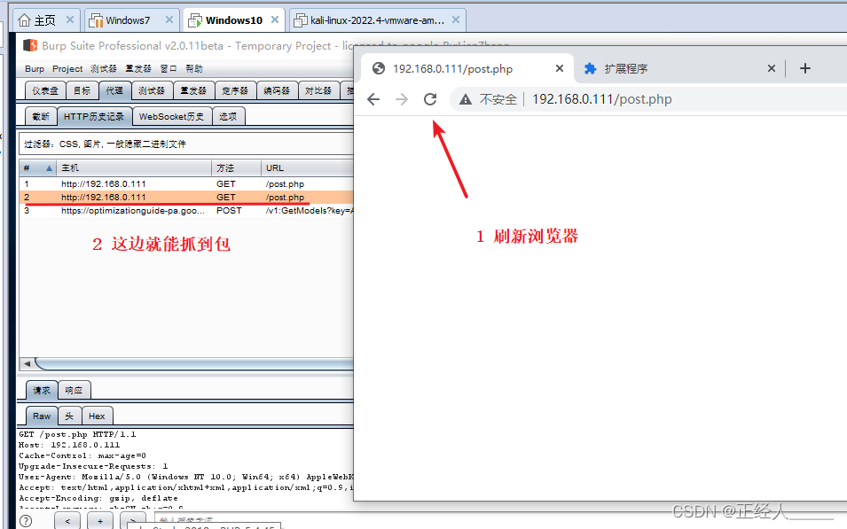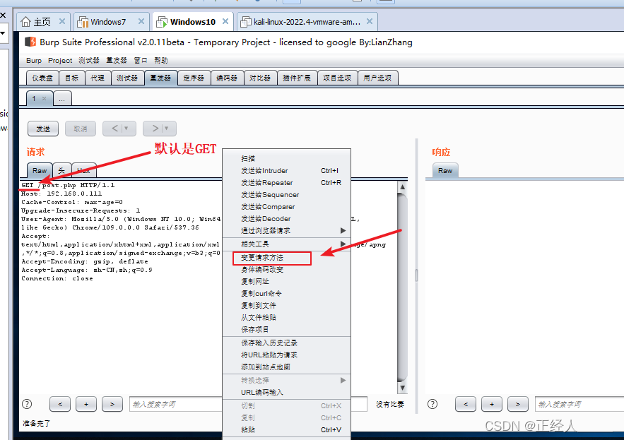 4)抓到的数据包的请求方法默认是GET,我们这里要测试POST请求所以这里要改一下