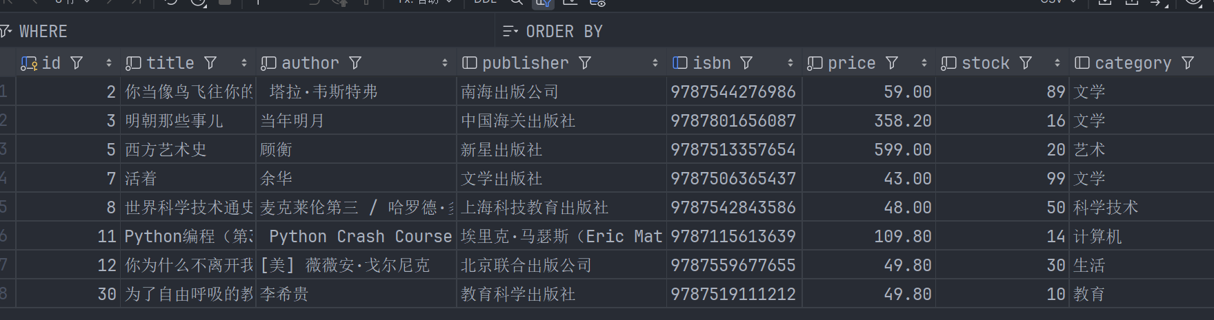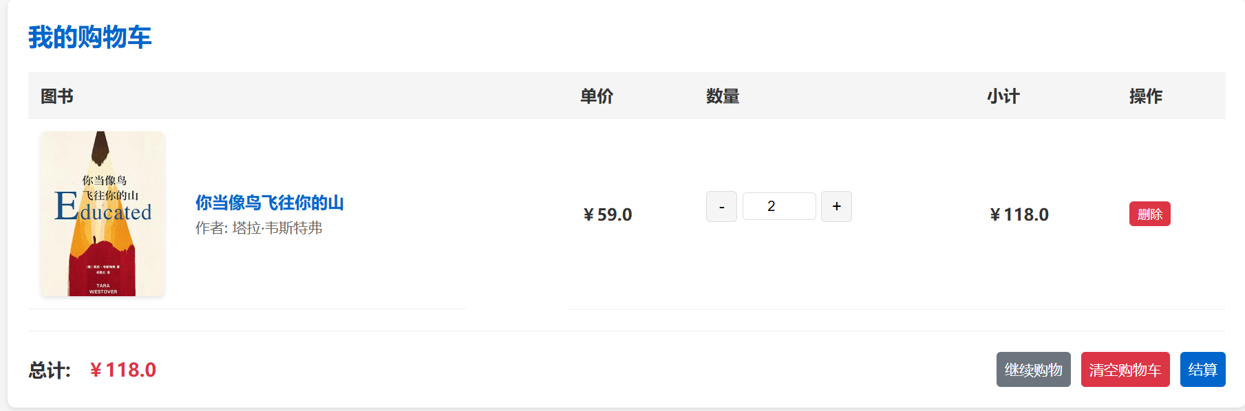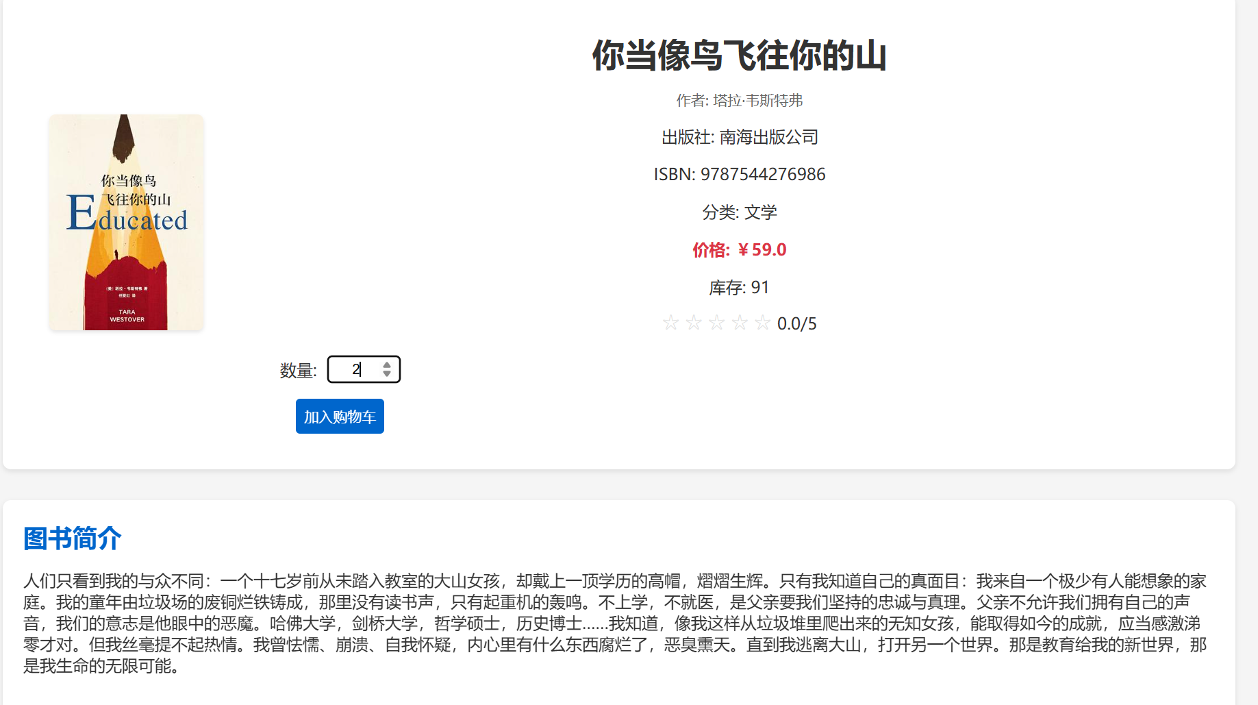 - 图书详情:展示图书的详细信息,包括书名、作者、价格、库存、描述等