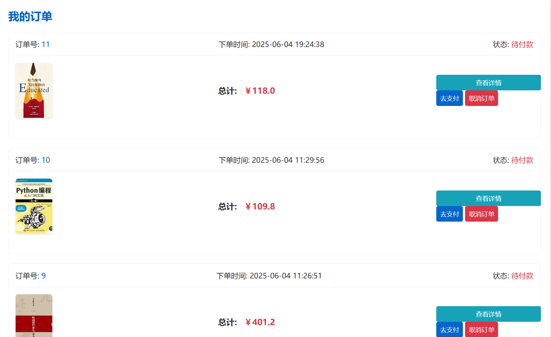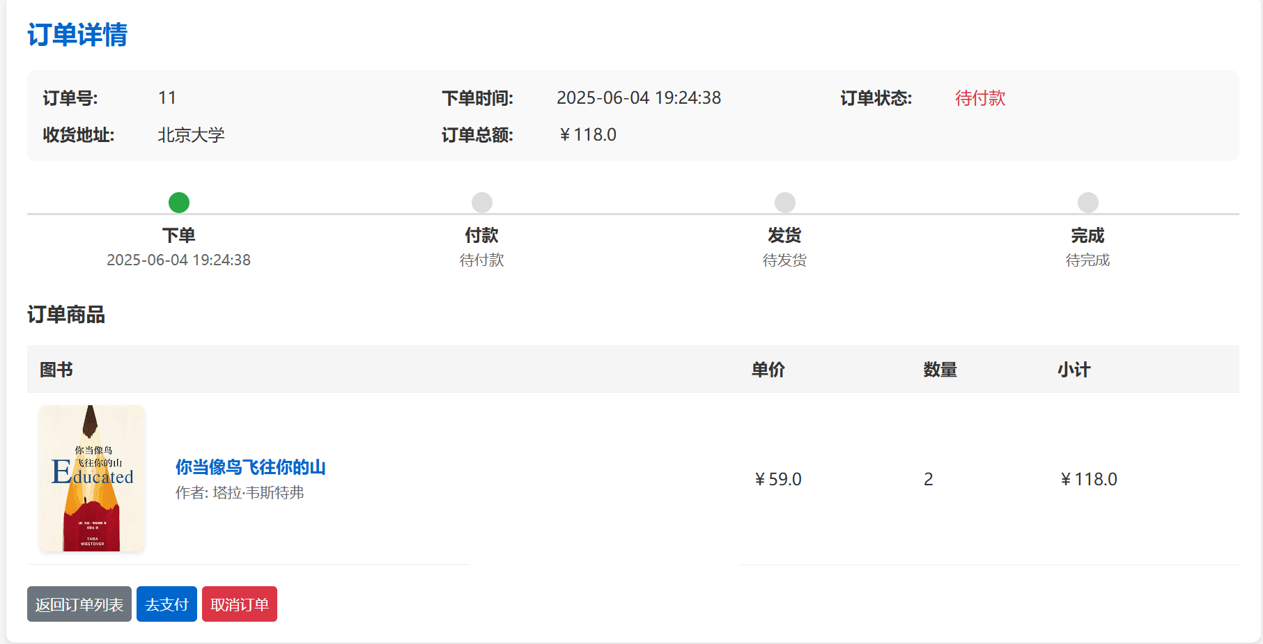 - 订单详情:查看订单的详细信息,包括订单项、总金额、收货地址等