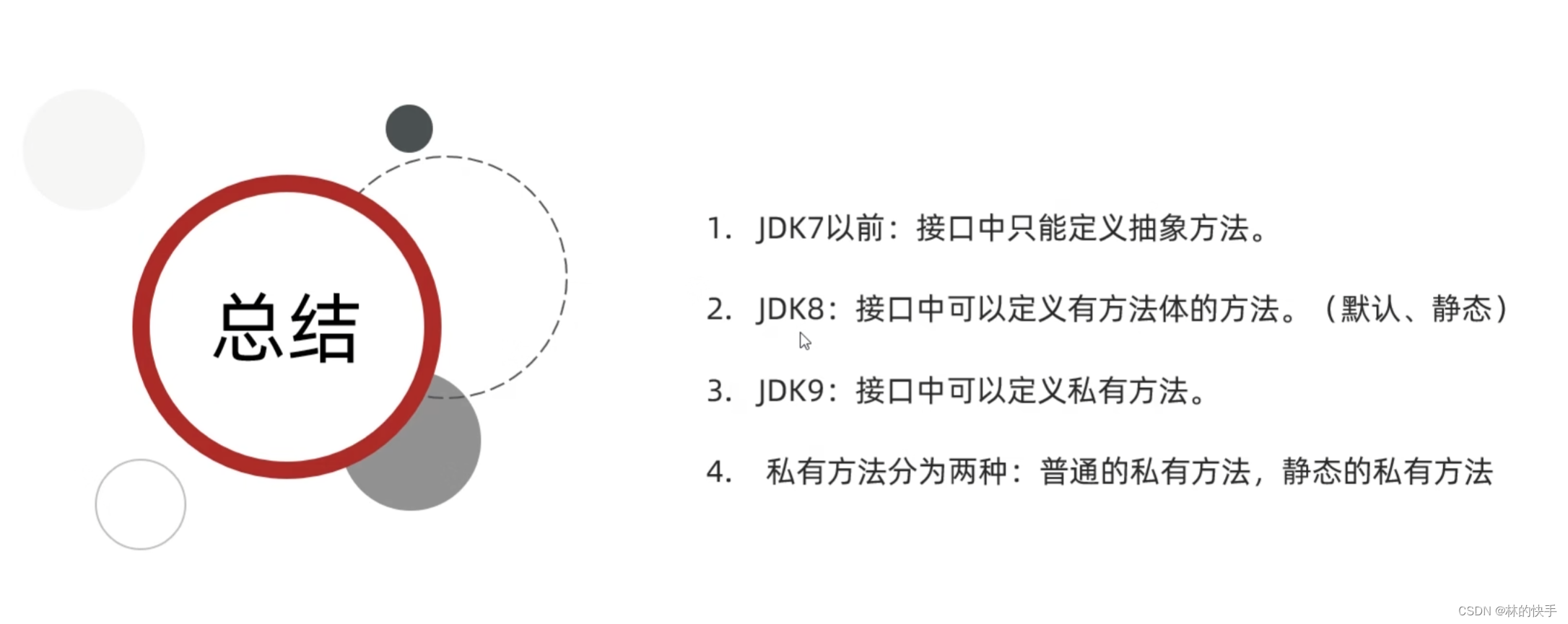 注意:接口中的抽象方法默认会自动加上public abstract修饰程序员无需自己手写!! 按照规范:以后接口中的抽象方法建议不要写上public abstract。因为没有必要啊,默认会加上。