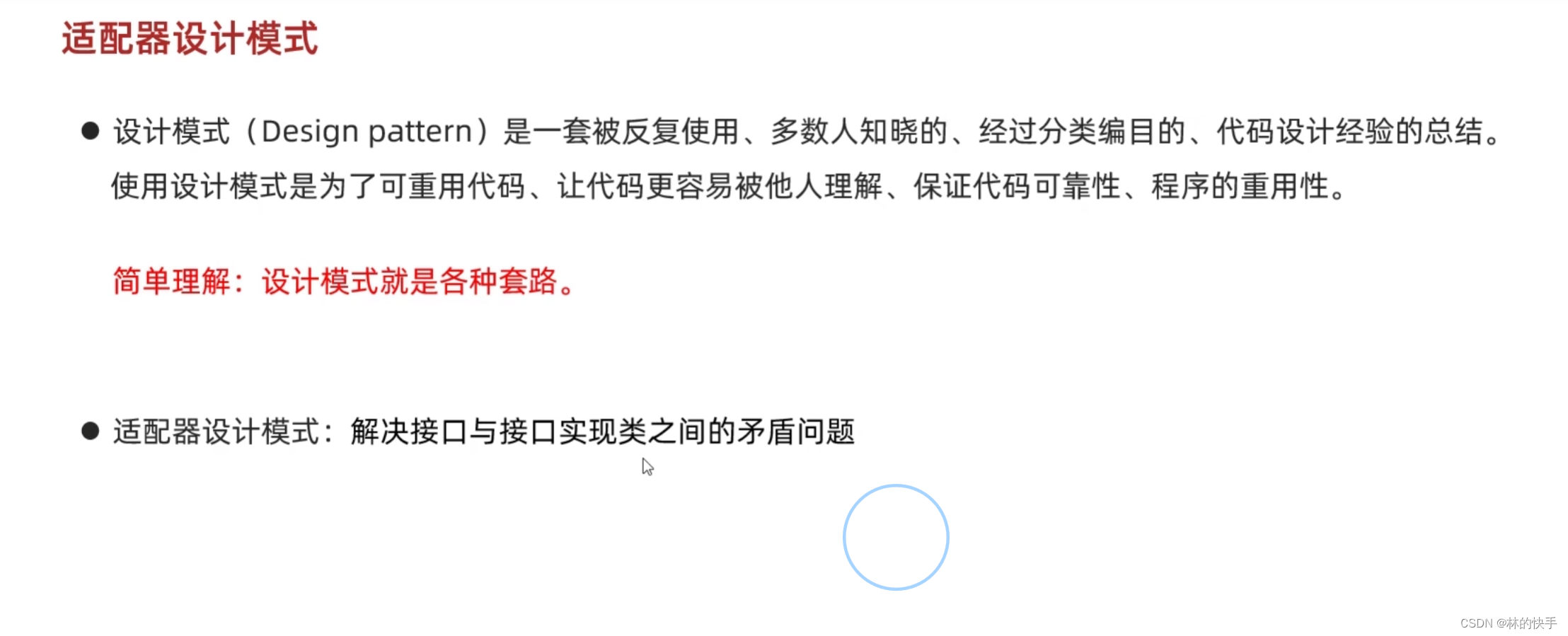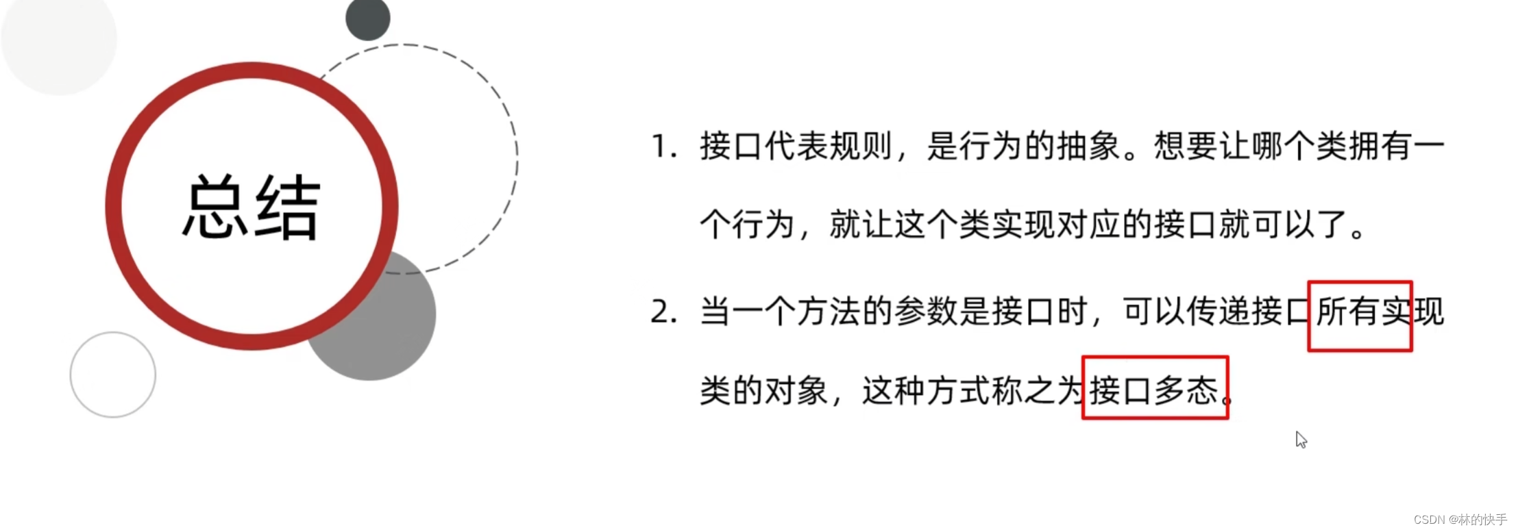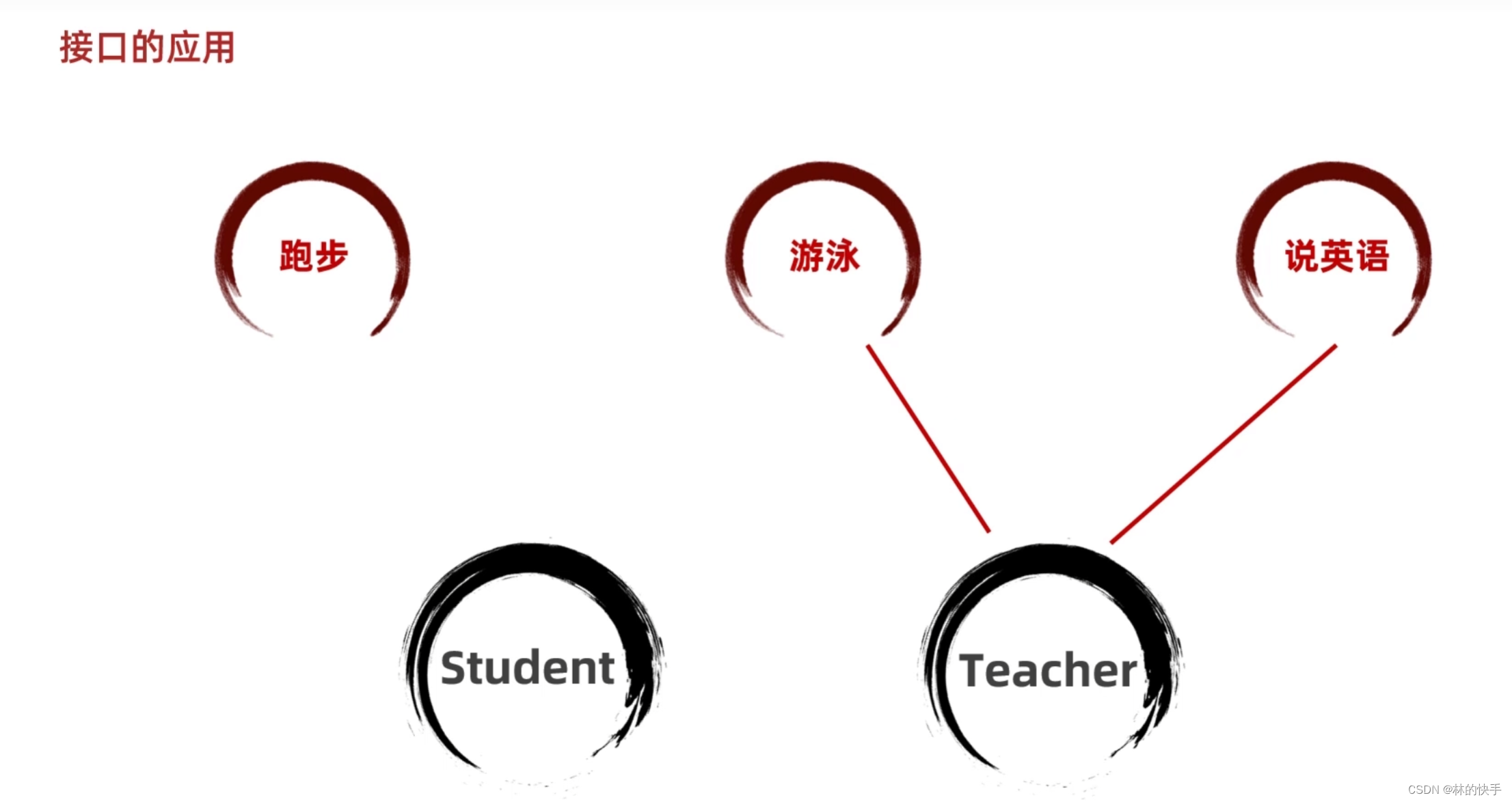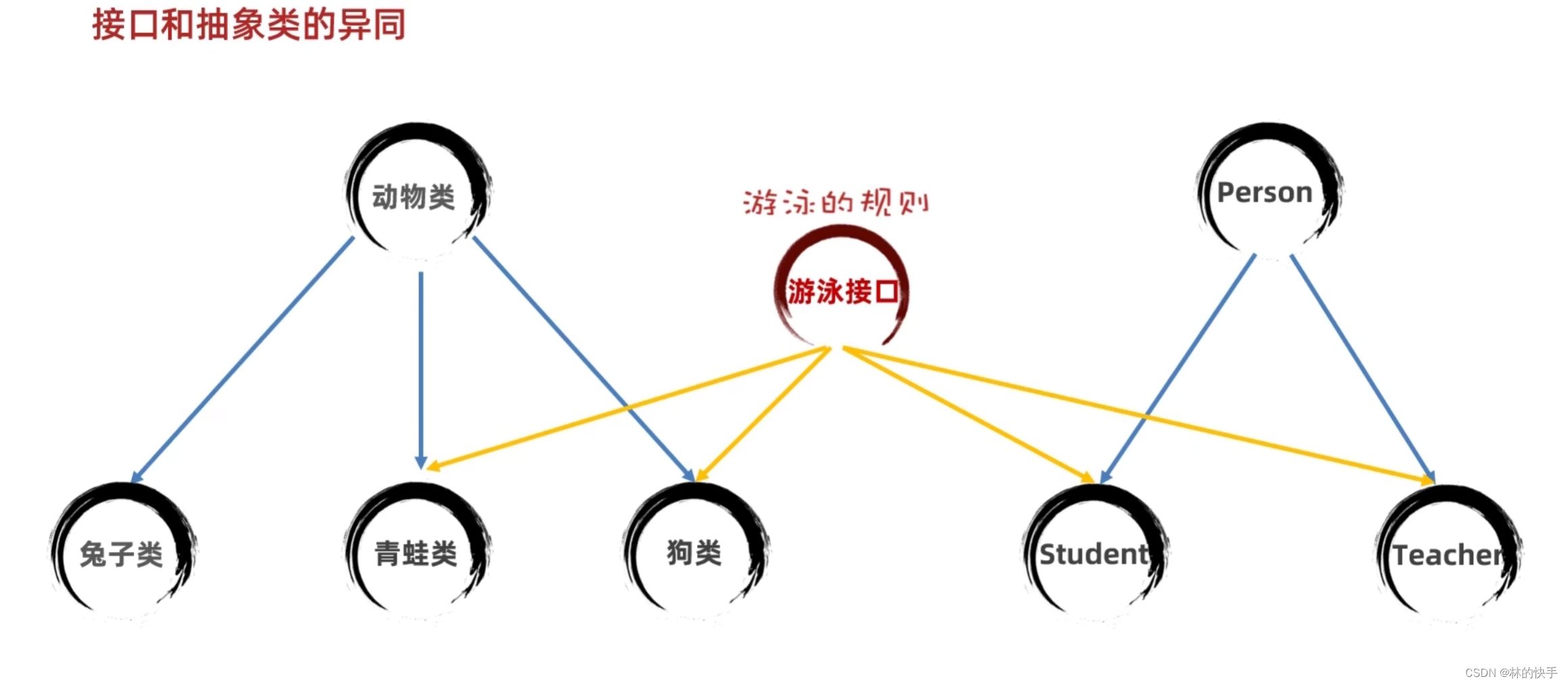 把特有的方法(行为)写成接口,要用的时候调用接口就行了,除了狗和青蛙要用到游泳这个行为,当我们需要给多个类同时定义规则的时候,就需要用到接口