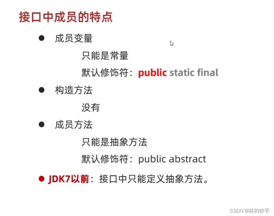 在JDK7,包括JDK7之前,接口中的只有包含:抽象方法和常量