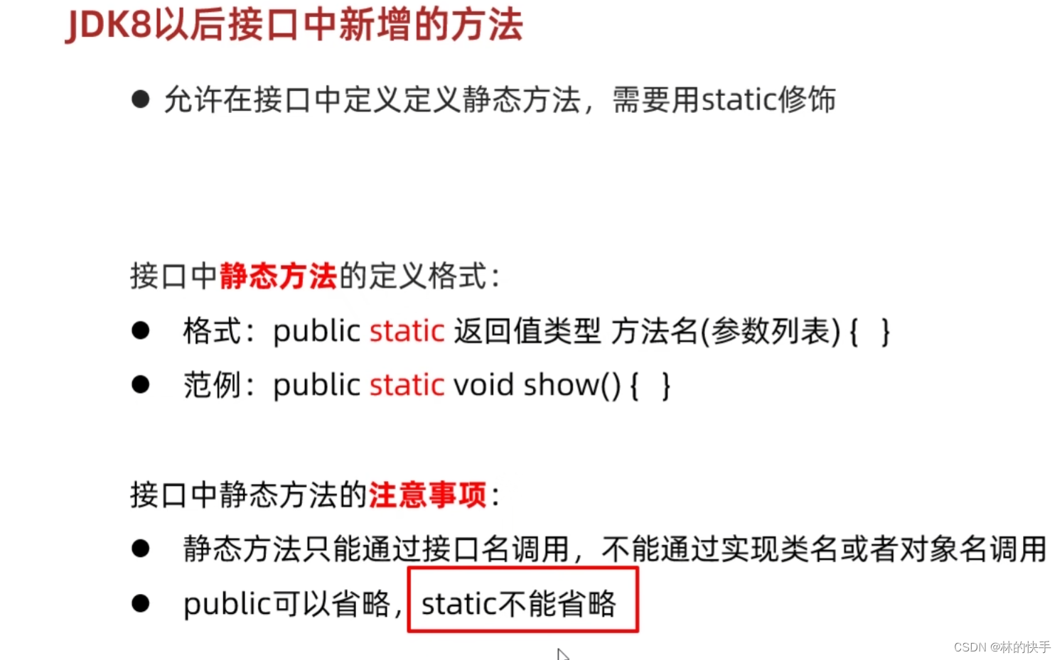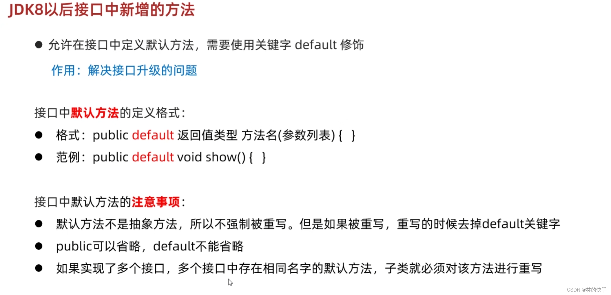 1.默认方法不是抽象方法,所以不强制被重写,但是如果被重写,重写的时候去掉default关键字