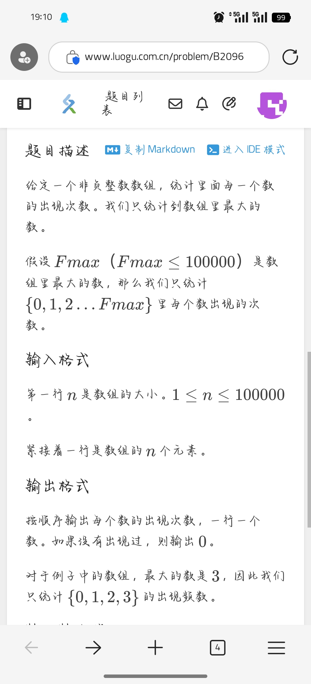还有一个条件是你需要算出第一个数组中的最大数,作为第二个数组角标的最大值第,二个数组的元素就是第一个数组元素出现的次数。