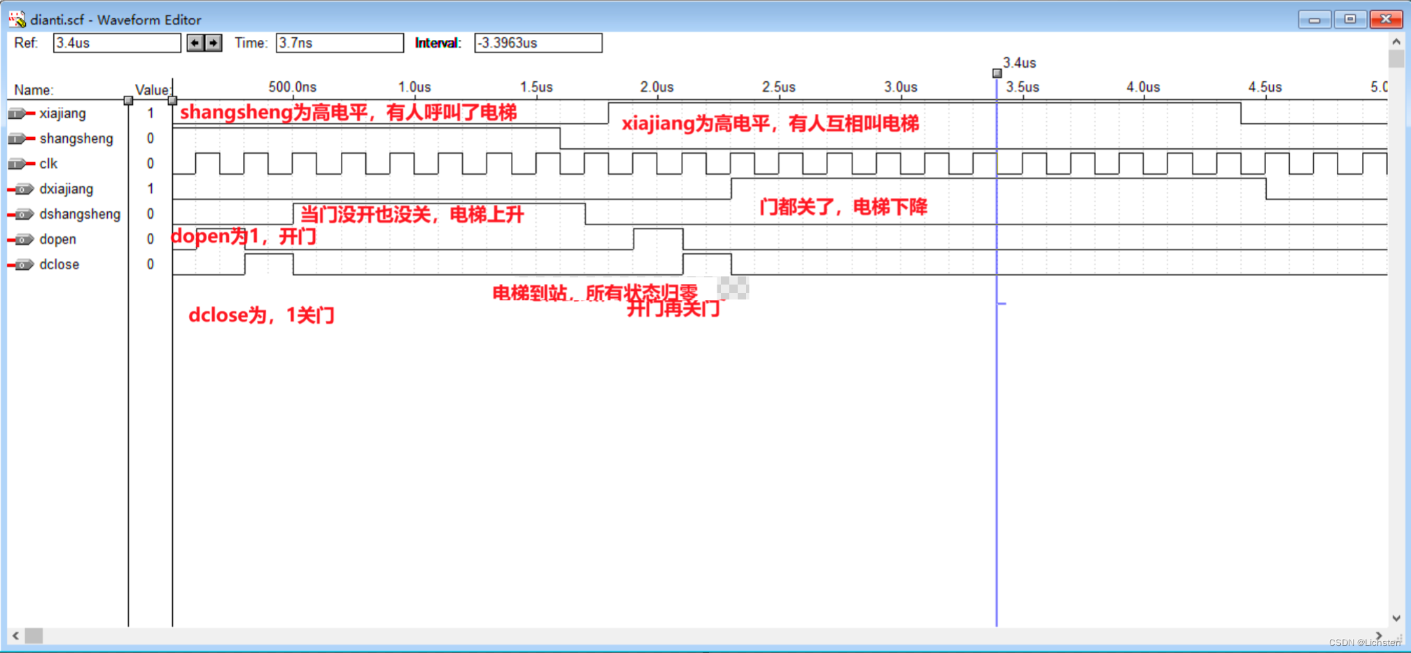 当呼叫电梯上升为高电平 1 时,先开门等待下一次脉冲在关门(模拟行人上电梯)当门关闭也就是关门状态为0 低电平时 电梯上升状态为高电平 1 当电梯到达时(呼叫电梯信号为低电平)重复开门关门操作。