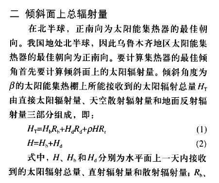 此时,我们通过查看论文的名字下载了《竖直墙面不同方位上太阳辐射量的计算分析》、《不同安装方式太阳电池板倾斜面上辐射量分析计算》和《乌鲁木齐地区太阳能集热器最佳倾角计算》。正如第一个论文的标题名字一样,此论文是对竖直墙面的太阳辐射量进行计算。可是我们的小屋有顶面,顶面是一个斜面。因此,这论文中的公式也不能直接拿来使用。我们查看第二个论文,发现没有公式。因此,也只能放弃。最后,我们查看一下《乌鲁木齐地区太阳能集热器最佳倾角计算》。我们发现了我们需要的、全面的信息。