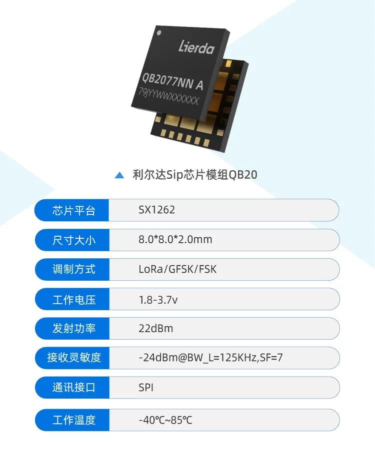 利尔达物联网全新发布的SiP芯片模组基于SX1262 DIE平台研发,包含QB20-C7和QB20-C8两款,仅工作频段与发射电流存在区别,满足欧标和美标用户需求。