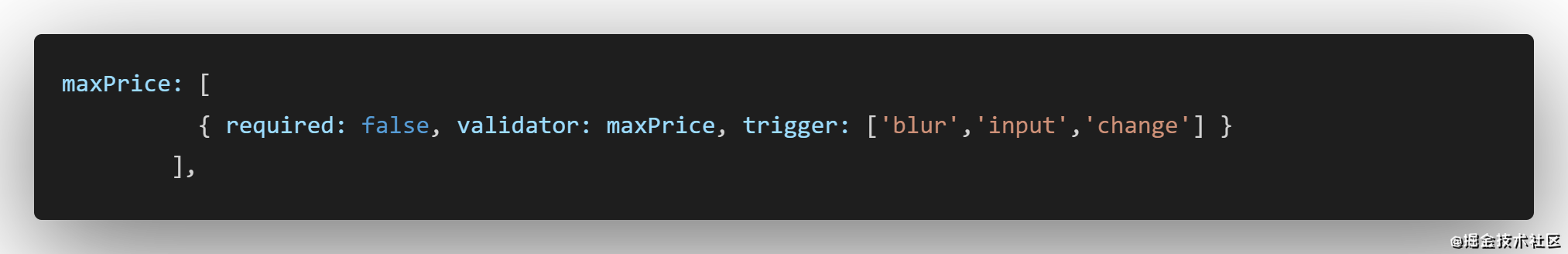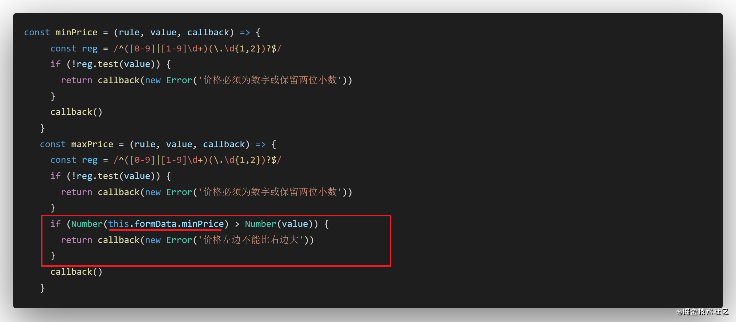 想要联动校验,注意看红框内是使用this.formData.minPrice去与当前方法的value做比较的