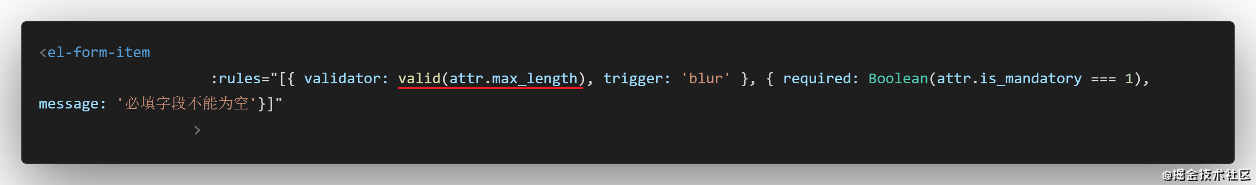 直接在el-form-item内绑定rules参数,校验规则选择自定义validator,值为一个写在methods生命周期内的valid方法,并且把参数传递过去