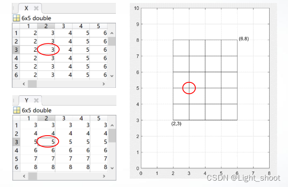 其中,参数x,y为向量,存储网格点的坐标为X、Y为矩阵