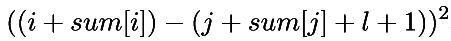 设a(x)=x+sum[x],b(x)=x+sum[x]+l+1a(x)=x+sum[x],b(x)=x+sum[x]+l+1a(x)=x+sum[x],b(x)=x+sum[x]+l+1。那么原式等于(a(i)−b(j))2(a(i)-b(j))^2(a(i)−b(j))2。