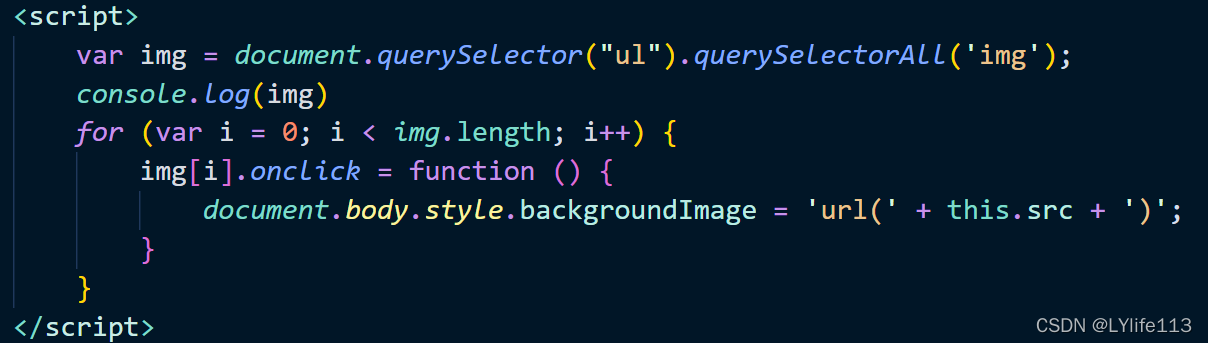 我们先用var获取到我们的图片,写完之后我们用console.log()在控制台打印看看获取到了没有,养成一个习惯,接着用for循环遍历这几张图片,然后给他们设上点击事件,