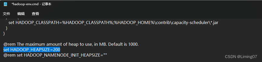- 编辑hadoop-env.cmd脚本文件,减少预制空间