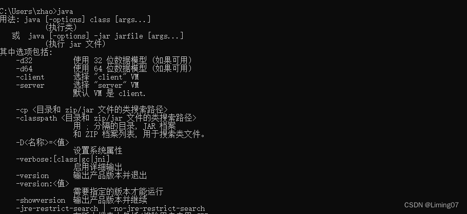 - 配置之后通过cmd命令窗口,执行java,如果没有报错“找不到命令”等情况,那么JDK安装就成功!