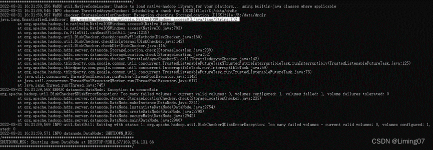 Windows的文件系统与Linux的文件系统相差过大,因此直接在搭建好hadoop之后很可能不会成功运行,报错如下