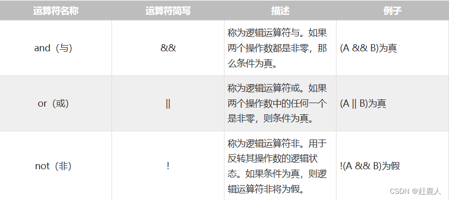 第一段代码注解:先定义了两个布尔变量,再将2、8、13三个引脚分别初始化为上拉输入、上拉输入、输出模式。尔后的循环函数中,监测2、8两个引脚的状态并将其分别赋予前面定义的两个布尔变量。判断语句中,当两个变量都不为零时,设定13号引脚为高电平,点亮LED。其他情况均将13号引脚设定为低电平,熄灭LED。此处运用了一个逻辑运算符与(&&),当两个变量都不为零时,返回结果为真,否则为假。关于逻辑运算符作用见下图
