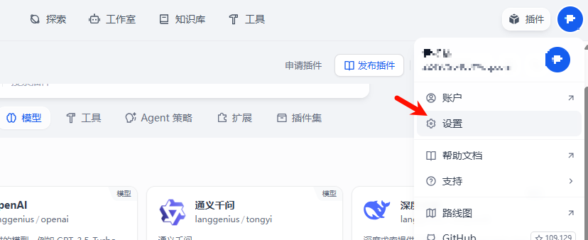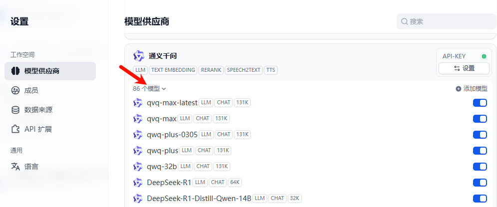 step3 在 Dify 设置页面中,按照下方图片中箭头的位置进行点击,能够看到若干模型列表,说明通义千问配置成功。