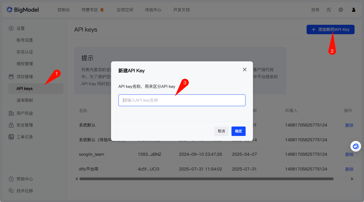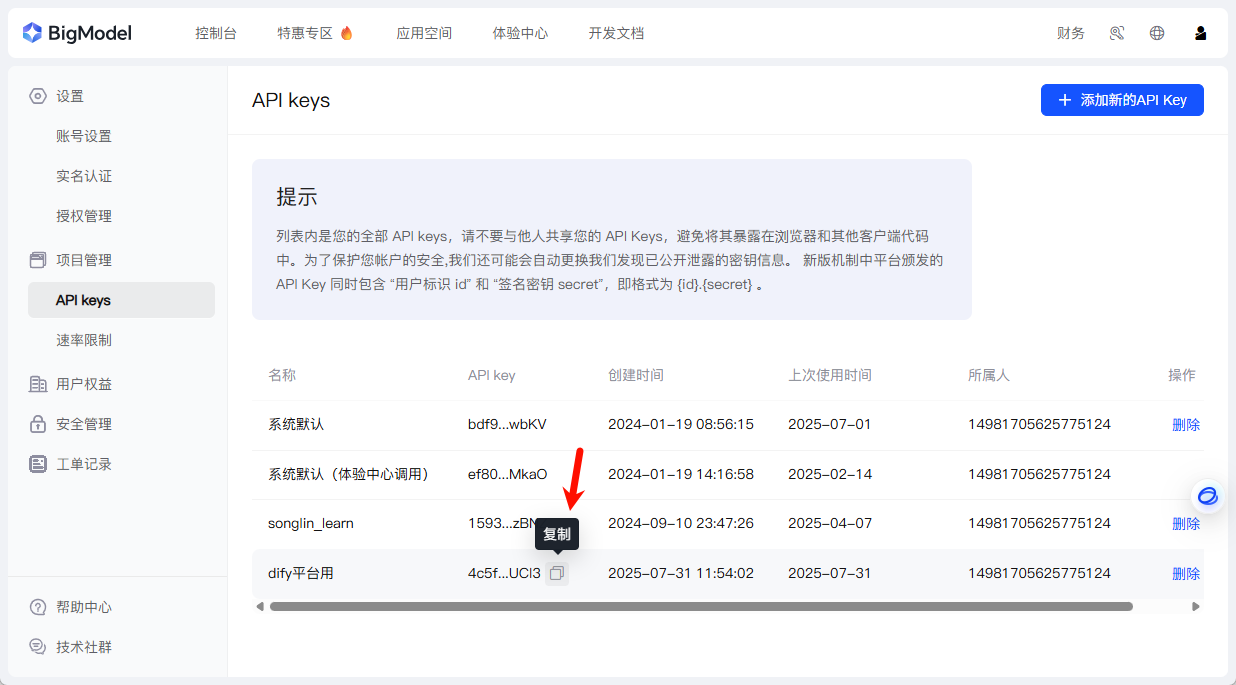 登录智谱 AI 官网,依次点击【API keys → 添加新的 API Key】,新建 API 密钥。