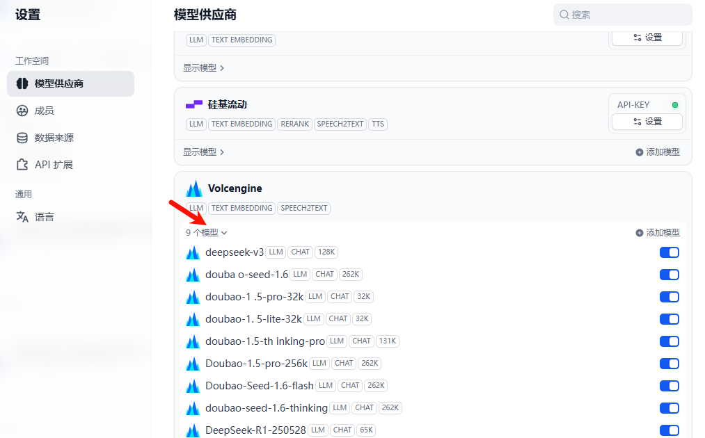 step3 在 Dify 设置页面中,按照下方图片中箭头的位置进行点击,若能够看到若干模型列表,说明Volcengine配置成功。