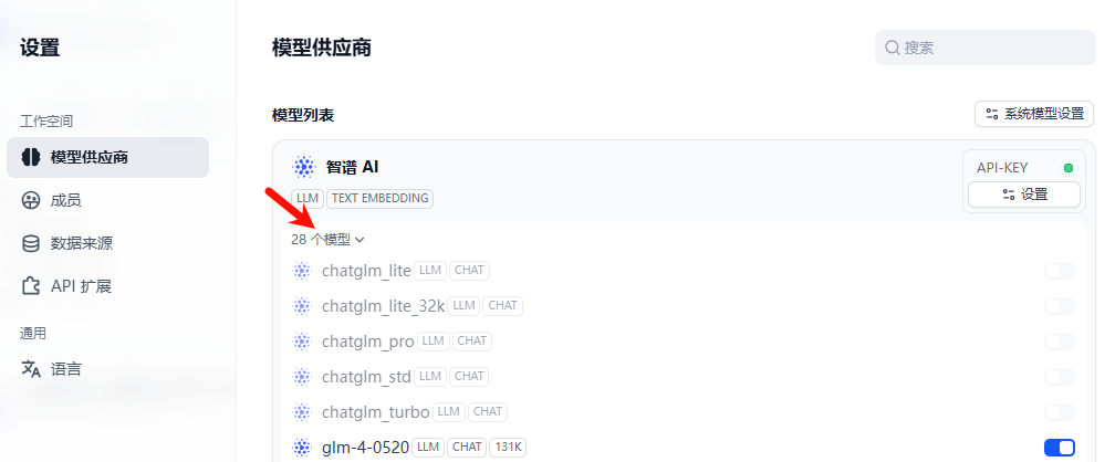 step3 在 Dify 设置页面中,按照下方图片中箭头的位置进行点击,能够看到若干模型列表,说明 智谱 AI 配置成功。