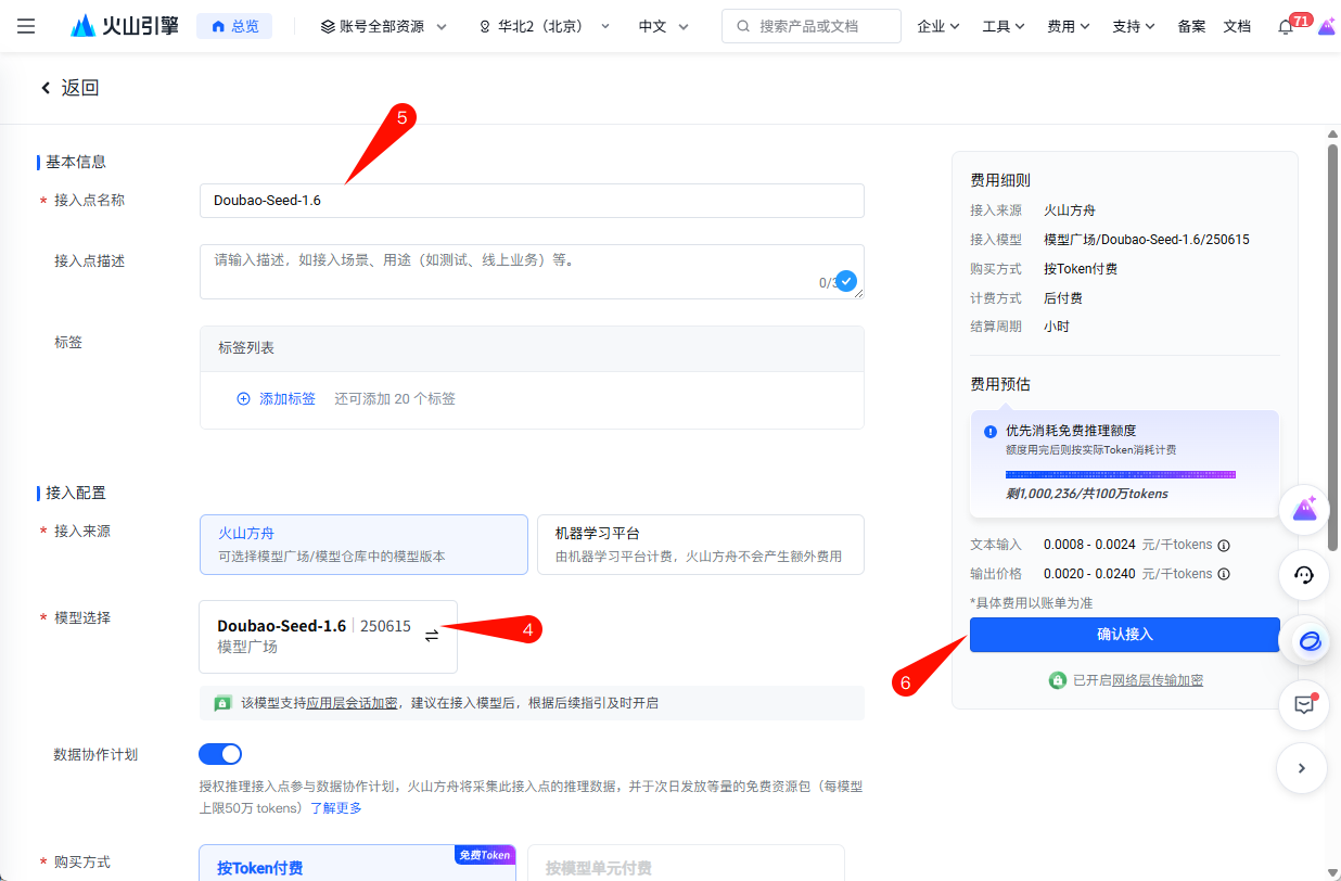 在火山引擎中,用户想要进行大模型推理还需要多一个创建推理接入点的步骤。首先,需要按下方图片依次点击【火山方舟 → 在线推理 → 创建推理接入点】,然后继续按图片进行【模型选择 → 接入点名称 → 确认接入】操作,即可。