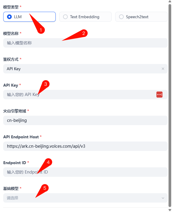 注意:具体过程参考以下图片,其中第 3 步输入复制的 API。第 4 步输入复制的推理接入点 ID。第 5 步选择具体的模型,且需要和第 4 步的模型能够对应上。