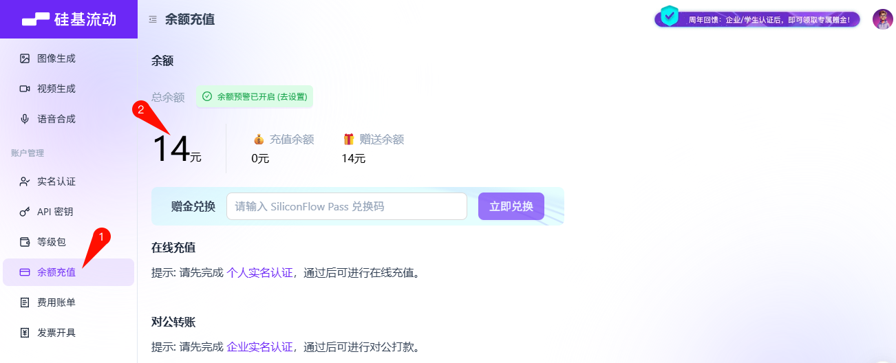 - 硅基流动官网会赠送新用户 14 元的使用额度。