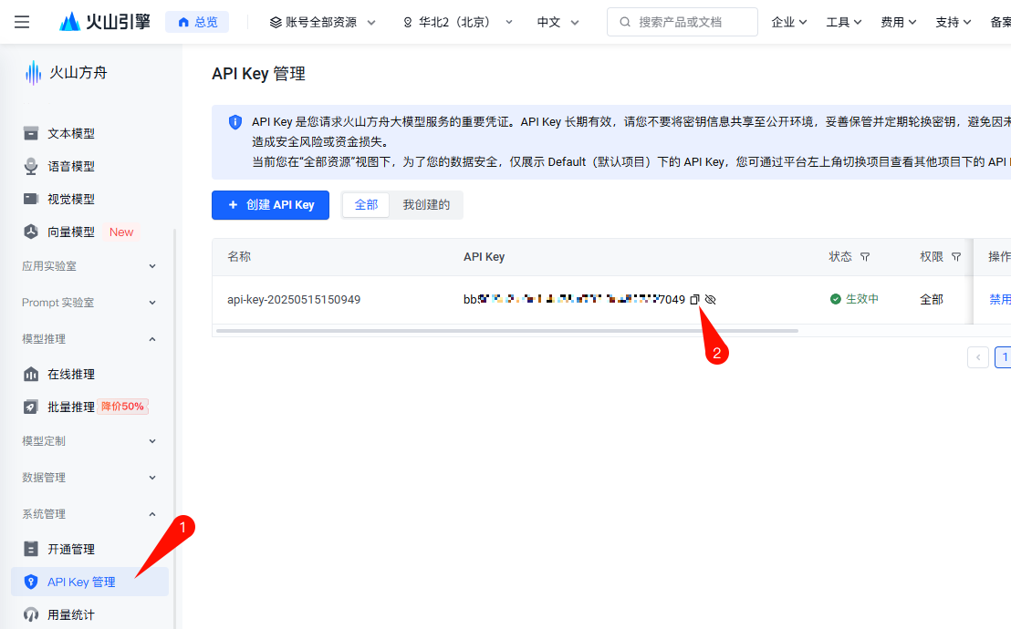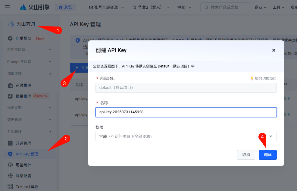 在火山引擎页面依次点击【火山方舟 → API Key 管理 → 创建 API Key → 创建】,新建 API 密钥。