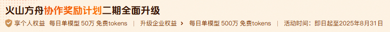 - 火山方舟官网会赠送用户每日单模型 50 万免费 token的使用额度。
