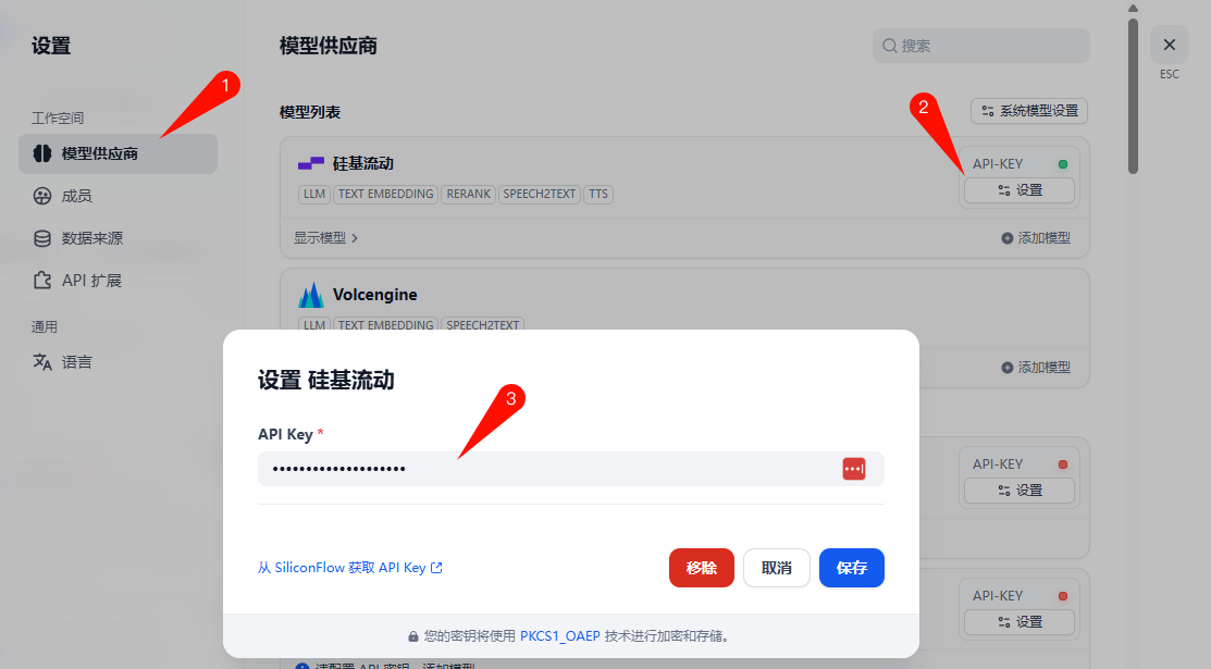 step2 打开 Dify 设置页面,然后依次点击【模型供应商 → 硅基流动设置 → 粘贴刚刚复制的 API】,即可完成硅基流动 API 配置。