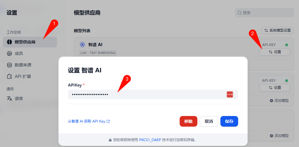 step2 打开 Dify 设置页面,然后依次点击【模型供应商 → 智谱 AI 设置 → 粘贴刚刚复制的 API】,即可完成 智谱 AI API 配置。