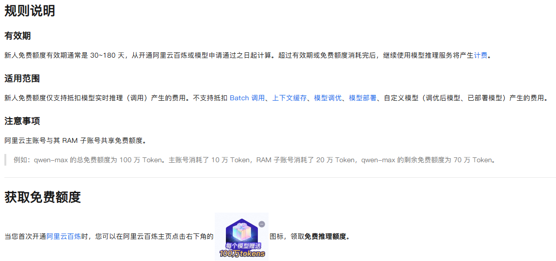 - 阿里云百炼官网会给新用户每个模型开通 100 万 token 的免费额度。