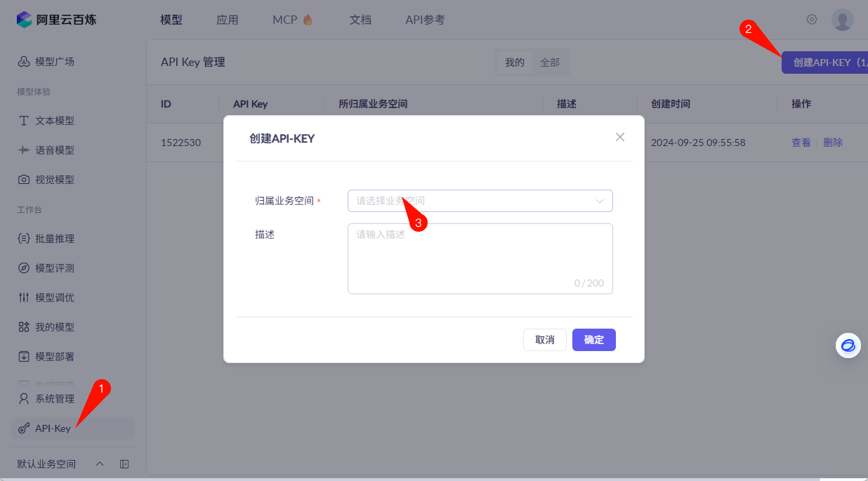 登录阿里云百炼官网,依次点击【API Key → 创建 API-KEY】,新建 API 密钥。