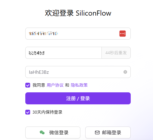 - 硅基流动注册地址:https://cloud.siliconflow.cn/i/IaHhE3Bz,填写手机号和验证码、同意用户协议,然后点击注册即可。