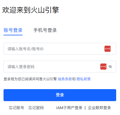 - 火山方舟注册地址:https://console.volcengine.com/auth/login/,填写手机号和验证码、同意用户协议,然后点击注册即可。