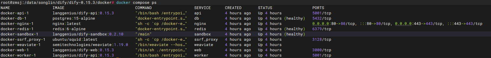 需要备份Dify原始项目的两个文件和一个目录:docker-compose.yaml 文件、.env 文件、volumes 目录。这三个部分共同构成了 Dify 项目的 “配置核心” 和 “数据核心”: