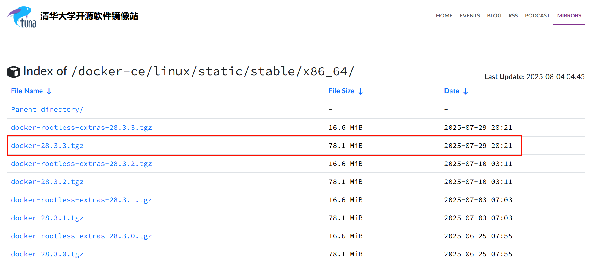 docker 安装包下载地址: https://mirrors.tuna.tsinghua.edu.cn/docker-ce/linux/static/stable/x86_64/。本文以 docker-28.3.3 为示例进行演示,用户可以根据自己的需求选择合适的版本。