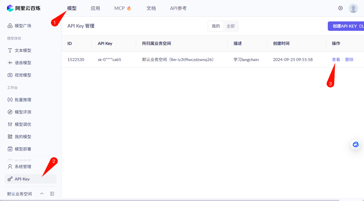 - 在阿里云百炼官网上按照下方图片,依次点击【模型 → API-Key → 查看】,得到 API Key