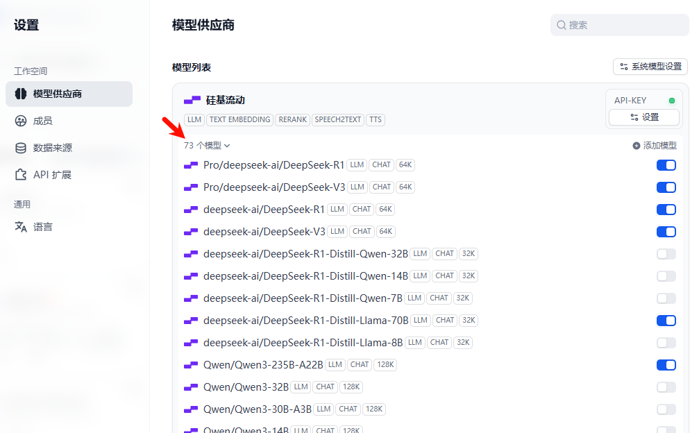 step3 在 Dify 设置页面中,按照下方图片中箭头的位置进行点击,能够看到若干模型列表,说明硅基流动配置成功。