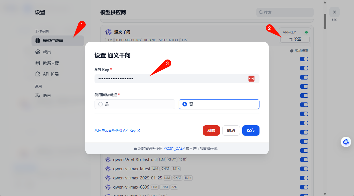 step2 打开 Dify 设置页面,然后依次点击【模型供应商 → 通义千问 设置 → 粘贴刚刚复制的 API】,即可完成 通义千问 API 配置。