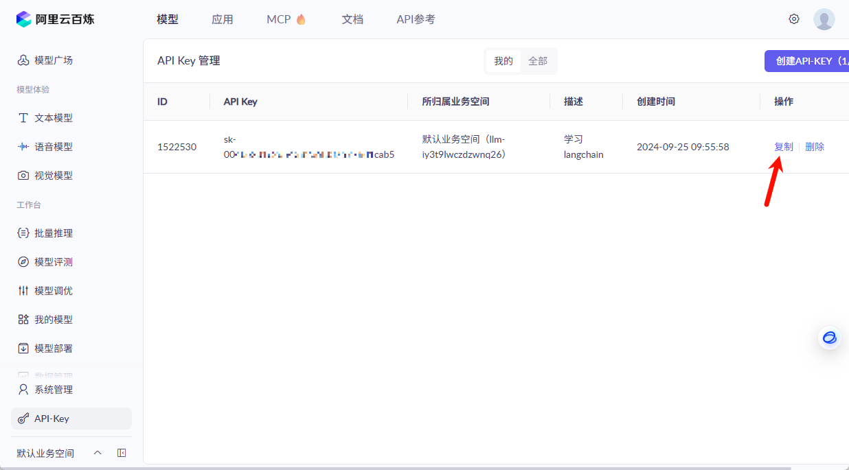 step1 复制阿里云百炼官网上刚刚创建的密钥。