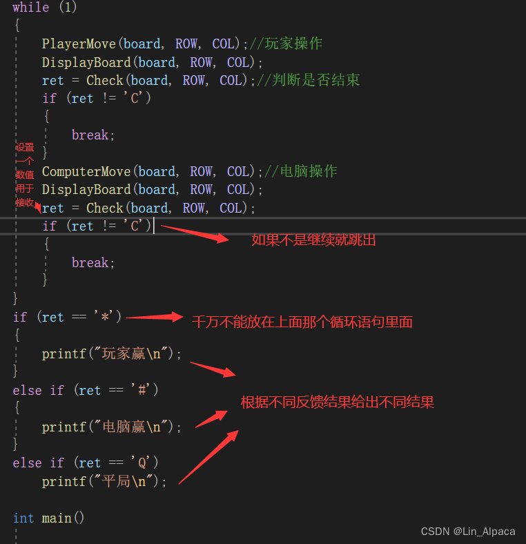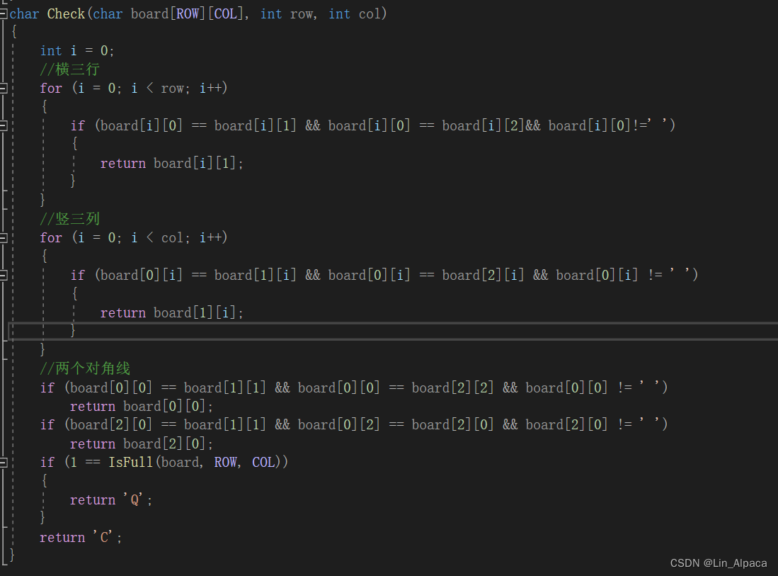 当一个人下完之后便会有四种结果即玩家赢 电脑赢 平局 继续走,那我们就以三字棋的规则来判断是否结束游戏再反馈不同的数字表达不同的结果。(这边return 的是字符类型的数据所以在声明的时候要用char来声明。