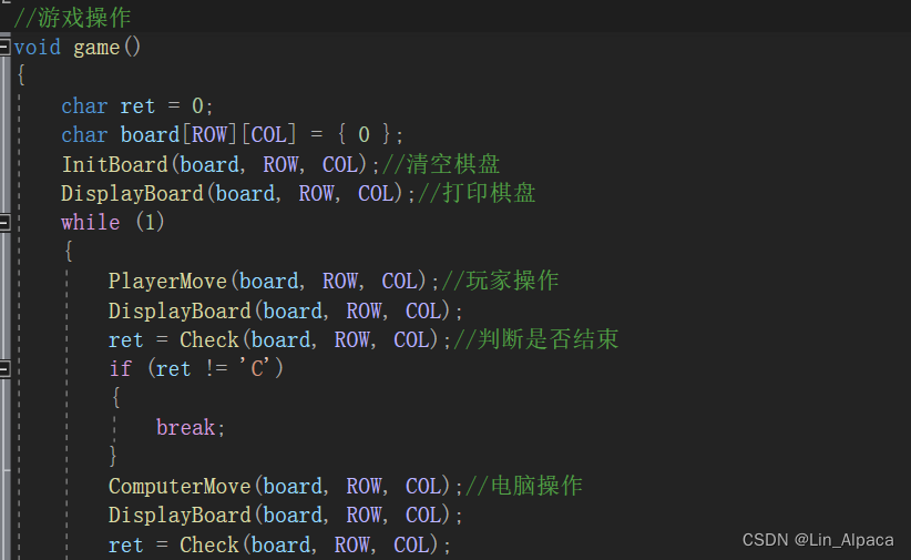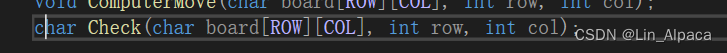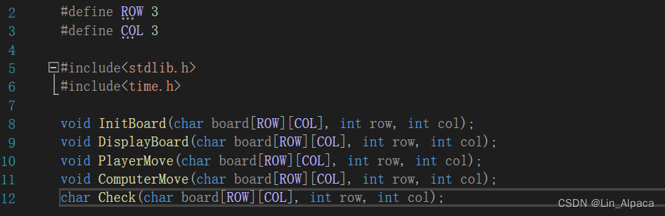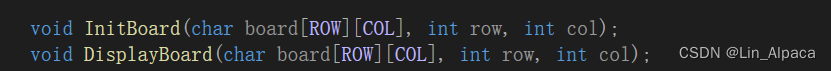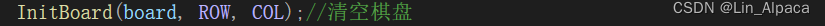 每一局开始时我们都要确保棋盘是空的,所以自定义一个 Initboard函数(当然取其他名字也可以),同时在game.c和game.h文件中进行实现和声明。将我们要用到的参数传输出去。text.c和game.c文件中都要引用game.h文件(注意:引用自己的头文件时使用的是" "而不是<>)