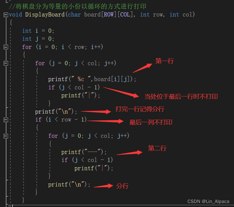 直接打印并非不行,但若我们想要棋盘随着我们前面定义的行和列的改变而发生变化的话,就无法通过直接莽的方式来实现。将棋盘拆分之后我们可以发现第一行是 | | 第二行是---|---|----以此类推,在最后一行没有 ---|---|----在最后一列没有一整条竖直线,这时候我们就想该如何实现这个函数。在细化之后我们可以看到第一行就是" |"且最后一列不打印"|"第二行就是"---|"最后一列也不打印"|",同时最后一行不打印"---|"。即我们使用for循环将这几个小步骤实现,并加上一些小条件使其在部分位置无法打印。