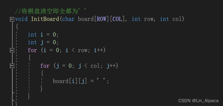 只要我们将' '赋值给数组中的每一个数,就能实现棋盘的清空。使用两个for循环将有效范围覆盖到整个数组,而且数组下标是从零开始的所以实际上我们只需要i j 的范围是0~2。