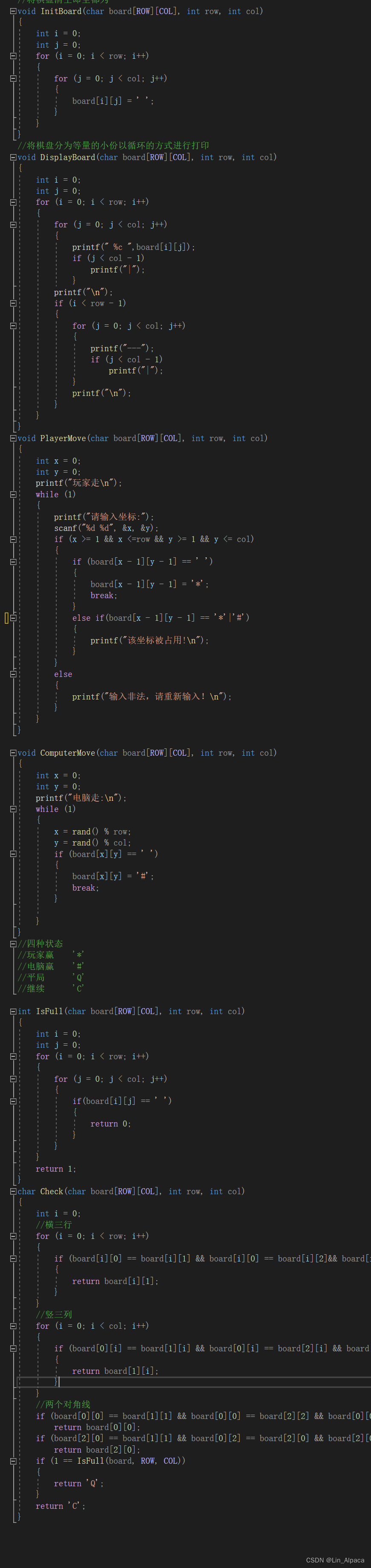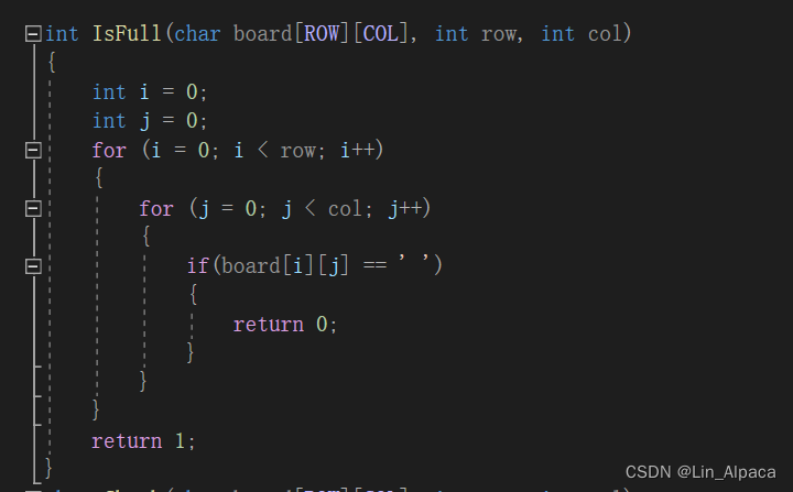 若非胜利则判断是否平局,新建了一个IsFull函数来判断棋盘是否全满,直接两个for循环一个判定。