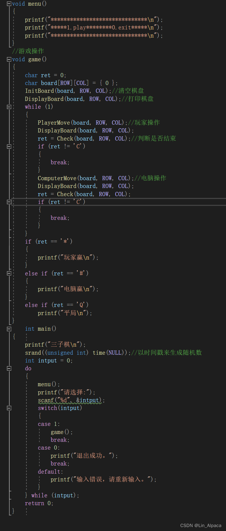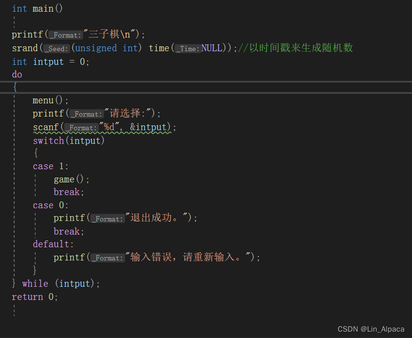 先把主函数打出来,一条一条看,首先先打出名字,srand先不看后面再来讲,定义一个参数,这里就要讲到关于这边循环语句的选择了,在这个地方我们要做到的是根据菜单进行选择,如果输入非法则需要重新输入。用while循环也可以,不过for循环就没有那么贴合实际应用了。同时,input的值为以0开始的整数因此可以设置成0退出游戏,1开始游戏,即当输入0时循环就自动结束。输入其他数值时便会循环。因此使用switch语句进行选择(if也行啦)再使用break跳出循环。同时设置了menu和game函数再主函数外进行声明和定义。这样子主函数大致就写完了。由于刚开始比较菜所以这次电脑下棋是通过取随机随机值来下的,以后精进一些就可以提升电脑的难度,让游戏更加完善。