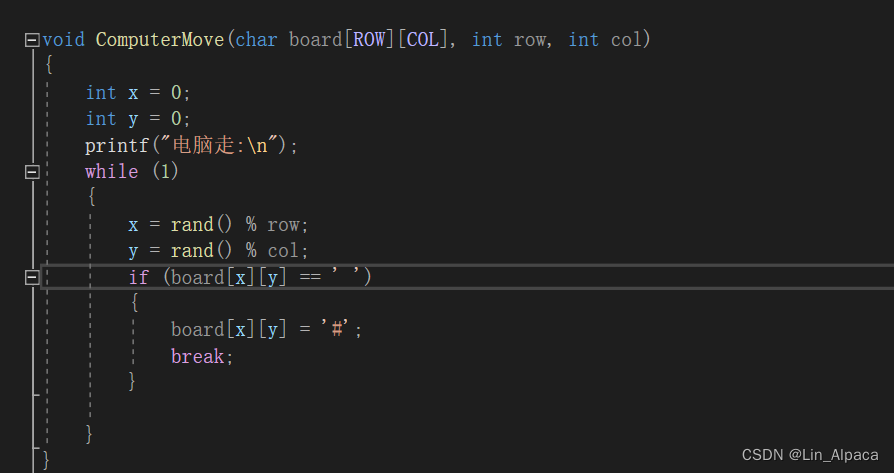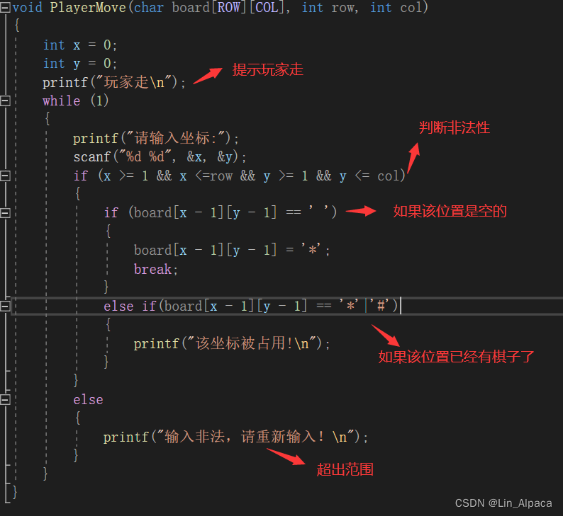然后到game.c文件中进行实现,简单想就是我们输入一个坐标然后将其放入到该数组之中,这样再将棋盘打印出来的话,就相当于我们下了一子。而且玩家并非程序员输入的坐标自然是根据棋盘上的坐标来输入因此输入的坐标会比数组的下标大一,使用我们要在涉及数组的定位时将输入的数值减1。同时要判断其合法性,必须要比0大但是要不能超过棋盘的行和列,否则驳回,且这阶段如果一直输入非法则要反复输入即要使用循环语句,while(1)则表示恒为真即无限循环,直到输入正确后用break跳出。